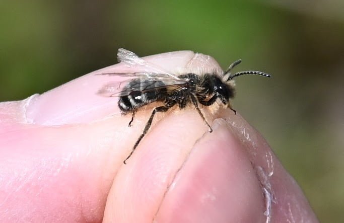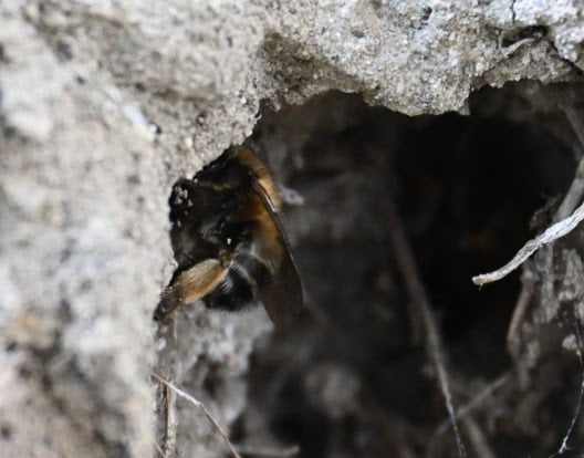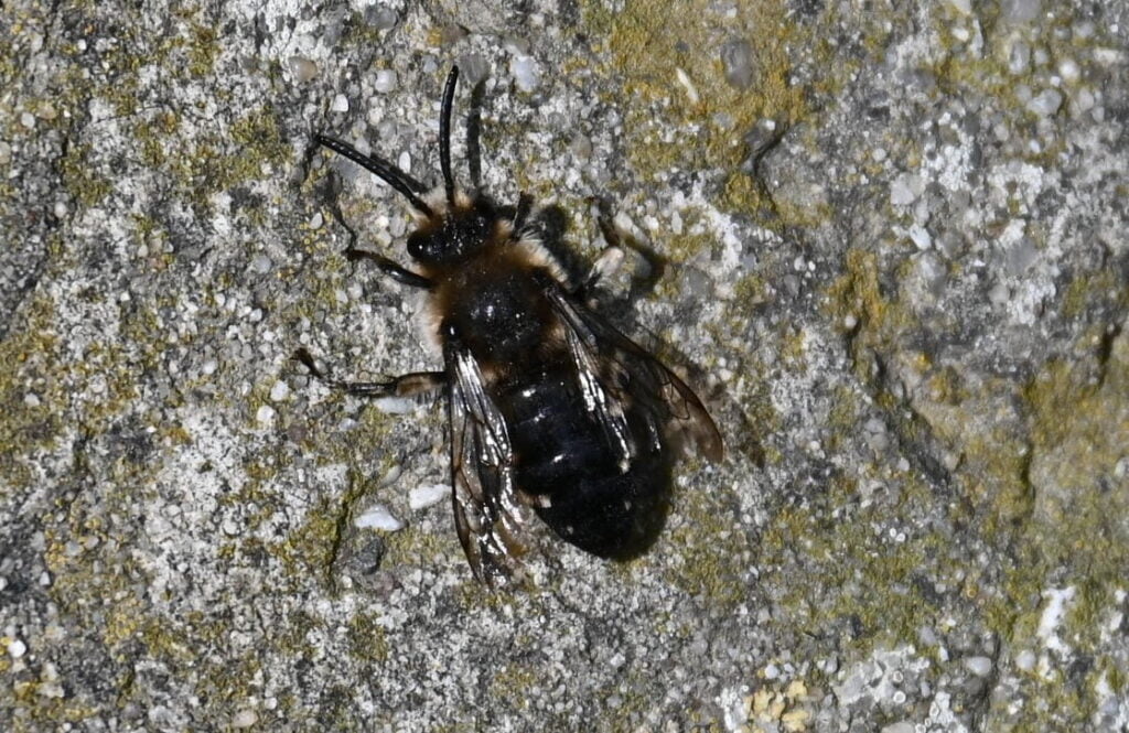 De Steenhommel kwam voorbij, Zandbijen, Wespbijen, Grasbijen en Viltbijen werden ook van dichtbij bekeken. Maar het mooiste van de dag was de ontdekking van de Bruine Rouwbij, niet één maar tientallen, onder de brug in het zand verschillende nestplaatsen van de Gewone Sachembij. De Bruine Rouwbij parasiteert op de Sachembij. Alle 3 waren we onder de indruk. Deze plek is niet ver van Houten, hopelijk weten deze 2 bijensoorten Houten weer te vinden in de toekomst.